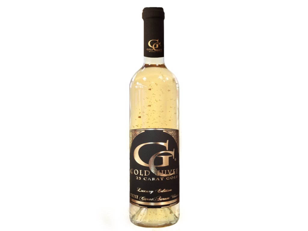 Miešaný alkoholický nápoj z bieleho vína a likéru s 23 karátovými lupienkami zlata.