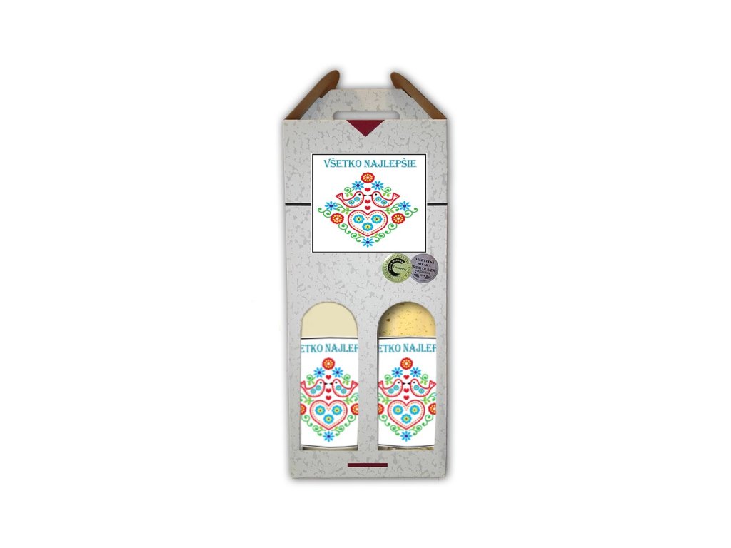 Darčekový set obsahuje Gold Cuvee 23 karátové zlaté lupene - nápoj s 23 karátovým zlatom + víno s etiketou s venovaním všetko najlepšie. Etiketa ľudový motív