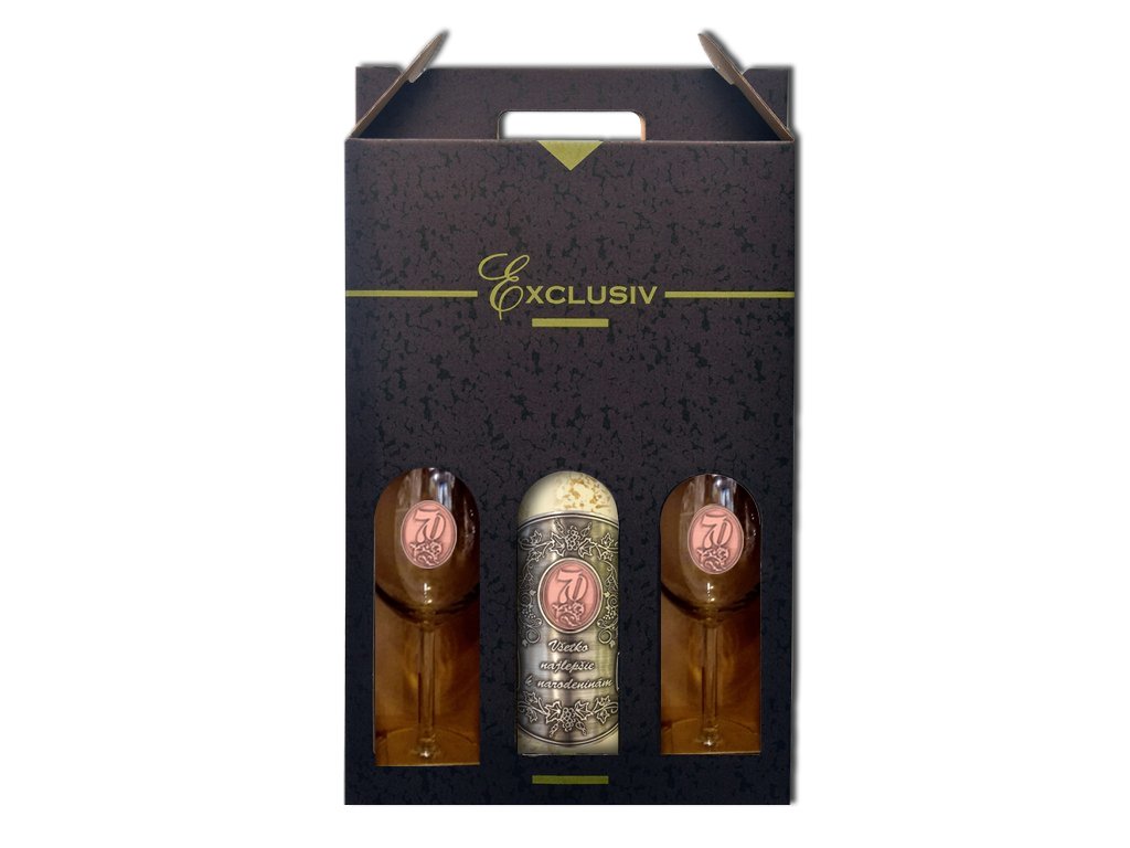 Darčekový set obsahuje Gold Cuvee 23 karátové zlaté lupene - nápoj s 23 karátovým zlatom s kovovou etiketou s venovaním všetko najlepšie k narodeninám s vekom + 2 ks pohár na víno s brondzovou pečaťou, darčekové balenie exlusive.