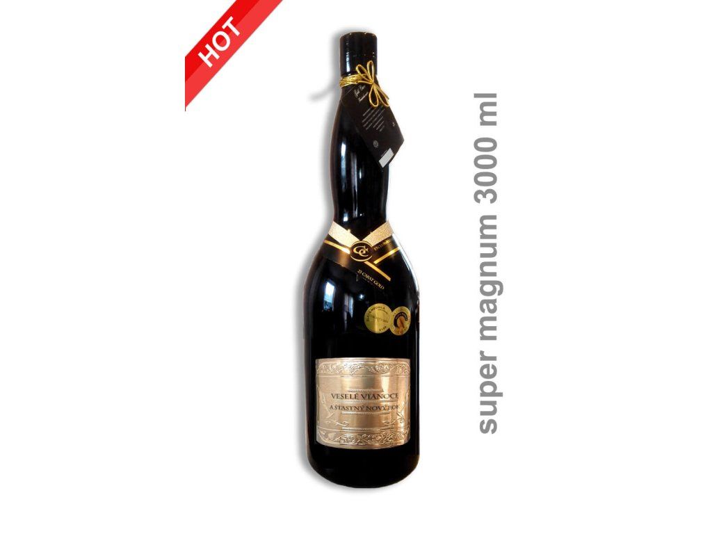 Ozdobné darčekové víno s objemom 3000 ml - Frankovka modrá. Etiketa kovová pozlátená - VESELÉ VIANOCE A ŠŤASTNÝ NOVÝ ROK.